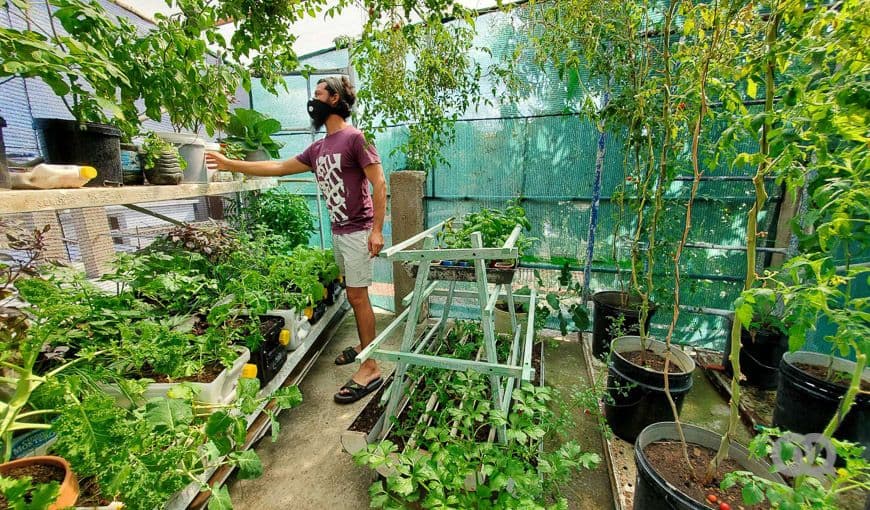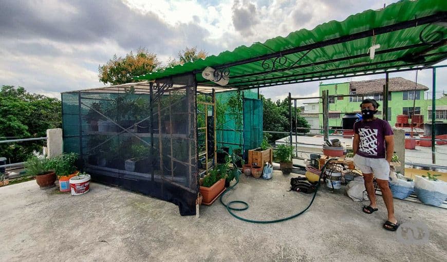 Oscar explica que un gran reto es el aire tan fuerte que corre en la azotea y que ese es el principal motivo por el cual los protege con mallas. Foto: Ernesto Verdecia.