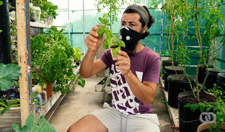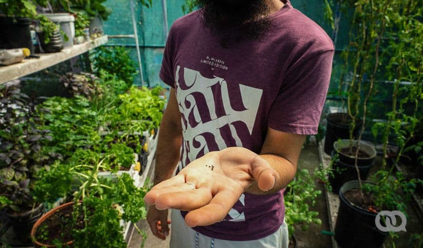Oscar. La poda sistemática aún en un período temprano de desarrollo ayuda a que crezca una planta mucho más frondosa a la vez que se puede empezar a consumir rápidamente. Foto: Ernesto Verdecia.Oscar explica que las tareas más complejas (además de encontrar semillas de calidad) son encontrar envases y tierra fértil, que se puede comprar o bien obtener mediante descomposición orgánica.
