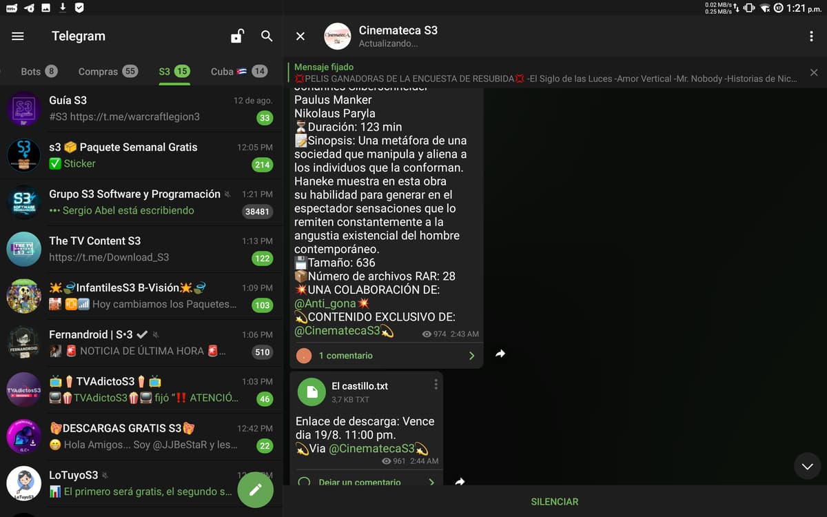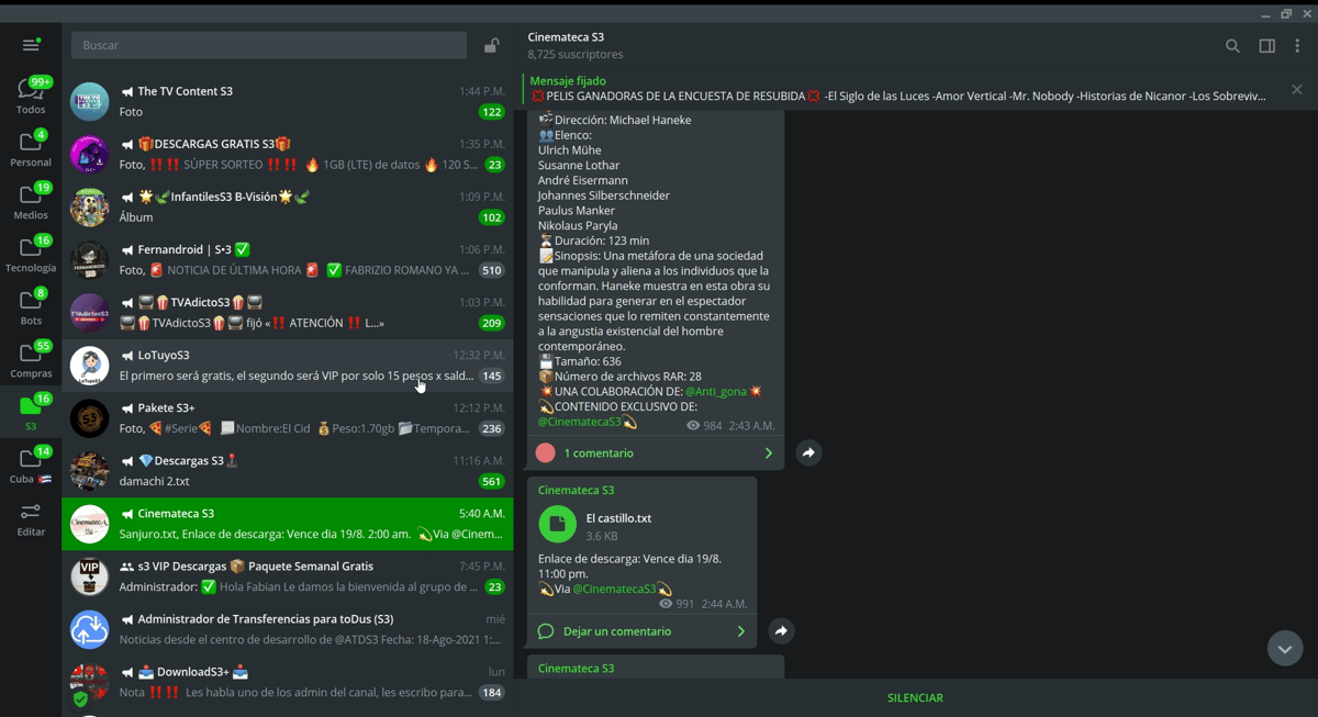 Hoy Cinemateca S3 cuenta con más de 8 700 suscriptores, pero está lejos de ser uno de los mayores canales. 🎁DESCARGAS GRATIS S3🎁, por ejemplo, tiene suscritos más de 32 600 usuarios, quienes reciben, además de los archivos para descargar contenido, publicidad de otros canales y servicios. La publicidad la realizan emprendimientos digitales como PublicidadQ | Pro.