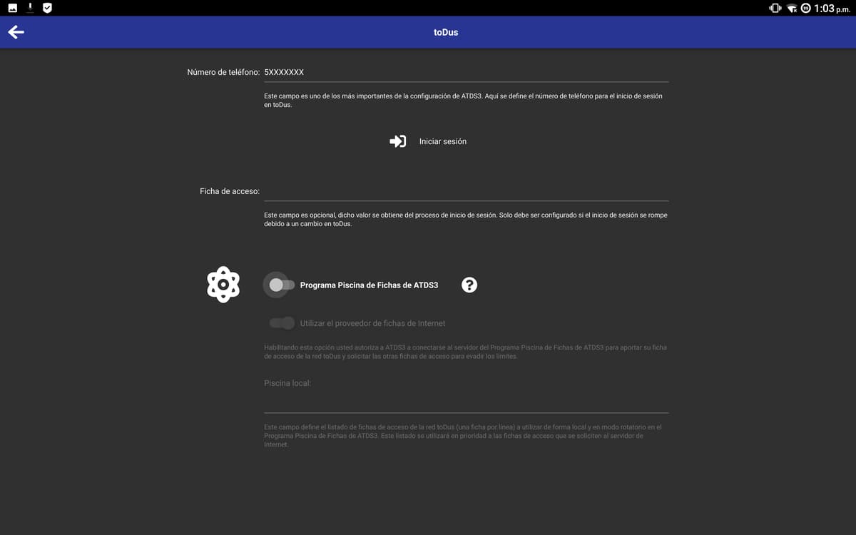 En el apartado «toDus», introducimos nuestro número de teléfono y pulsamos en «Iniciar sesión». A continuación, toDus nos enviará un SMS con un código que debemos introducir en la siguiente pantalla. Al confirmarlo, activamos la opción «Programa Piscina de Fichas de ATDS3» para saltar las restricciones de toDus.