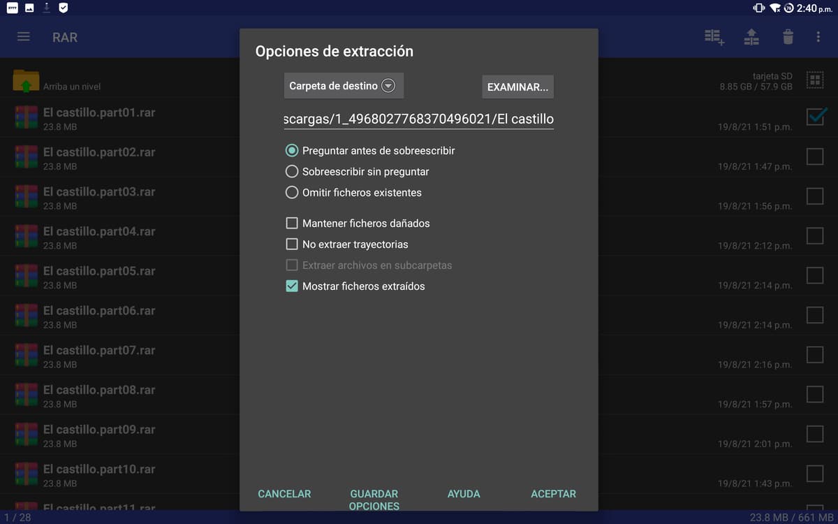 Captura de pantalla del proceso de descompresión mediante la aplicación RAR. Al descomprimir uno de los archivos, se descomprime el resto de manera automática.