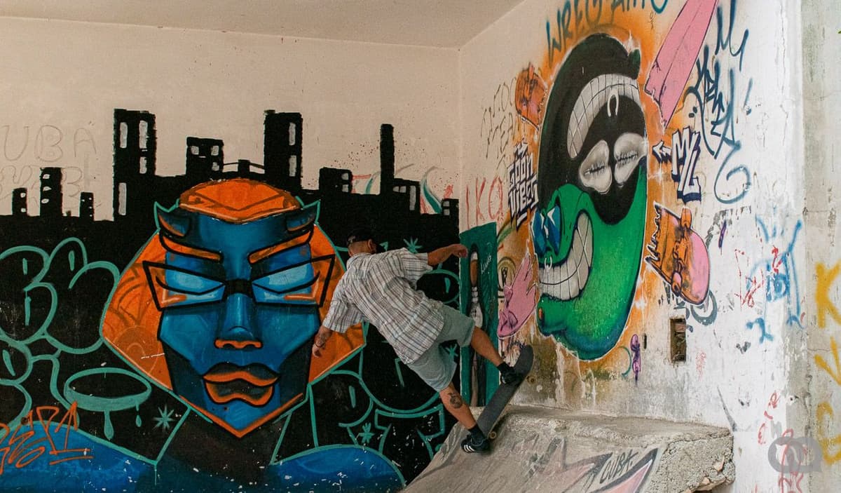 El skatepark de Ciudad Escolar Libertad, en Marianao, no es un sitio hermético, más bien está abierto por todas partes. Aun así, el sonido de las ruedas contra el suelo crea eco y se esparce por todo el lugar. Todo parece estar conectado por un sistema nervioso de concreto y cabillas. Las paredes de la planta baja vibran. Vibran los cráneos, los gorilas, los enmascarados, los seres amorfos y el resto de personajes de los grafitis y murales de Myl, Leandro «Sam33», Fabián «SuperMalo», Yulier P, entre otros artistas. Vibra el cartel, plasmado sobre uno de los muros, que reza: «Aquí estuvo el arte cubano».