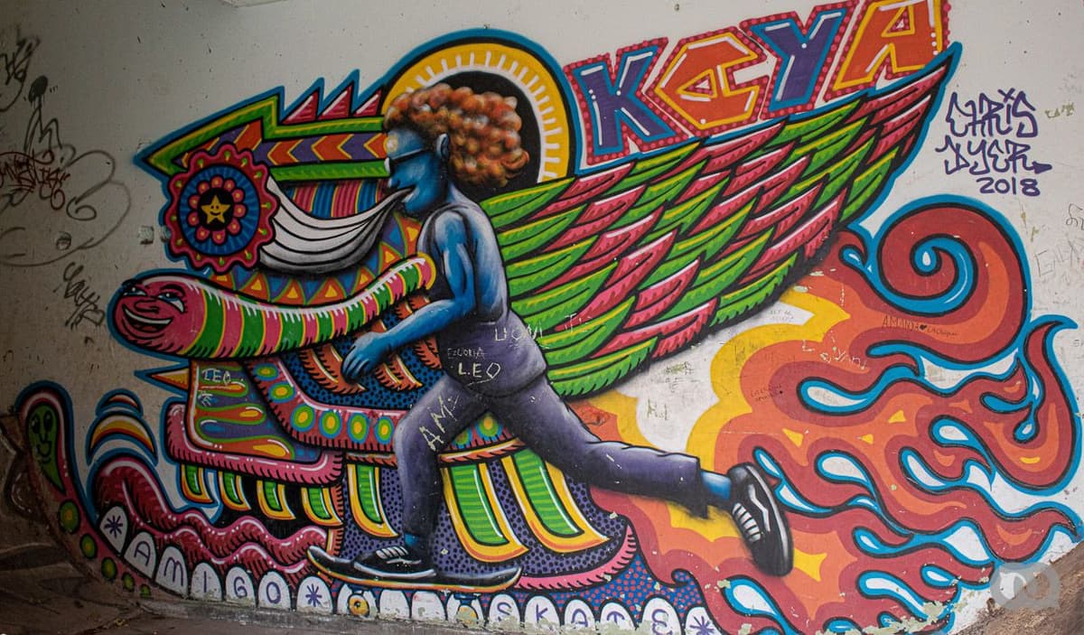 A la izquierda del mural con su rostro hay otro, hecho por el artista canadiense-peruano Chris Dyer. Este, con colores vivísimos, muestra a un joven de cabellos largos y ensortijados que avanza sobre una patineta dejando llamas tras de sí. En la parte superior derecha tiene escrito el nombre de Kaya; del pecho le sale un gusano colorido de rostro sonriente, como si el alma se le saliera del cuerpo para seguir repartiendo alegría; y en la frente, un círculo luminoso parece querer llenarlo todo de luz. En ese círculo, mezclada con la pintura, hay una parte de las cenizas de Kaya, que falleció en 2017, con 23 años.