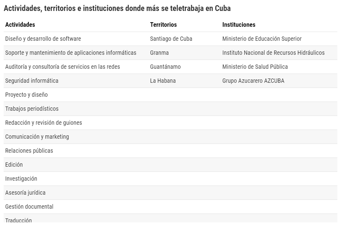 En Cuba, las personas empleadas en sectores como la Educación, la Intermediación Financiera y la Ciencia e Innovación Tecnológica (equivalentes a la clasificación de la CEPAL), sumaban 536.700 trabajadores en 2019 según la Oficina Nacional de Estadísticas e Información (ONEI), lo cual representaba el 11,71 % de la población ocupada en el país. Sin embargo, la mayor parte del teletrabajo desarrollado en la Isla se concentró en servicios profesionales, científicos y técnicos como la informática, la edición, la comunicación, la consultoría, el diseño de proyectos y la investigación.
