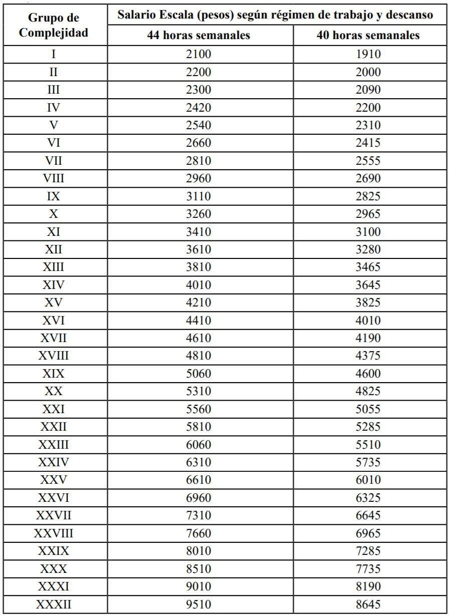 Esta escala está constituida por 32 grupos en dependencia de la complejidad y los requisitos de las labores, de menor a mayor. Estos a su vez están divididos en dos: los centros de trabajo que laboran 40 horas semanales y aquellos que llegan a las 44, máximo permitido por el Código de Trabajo.
