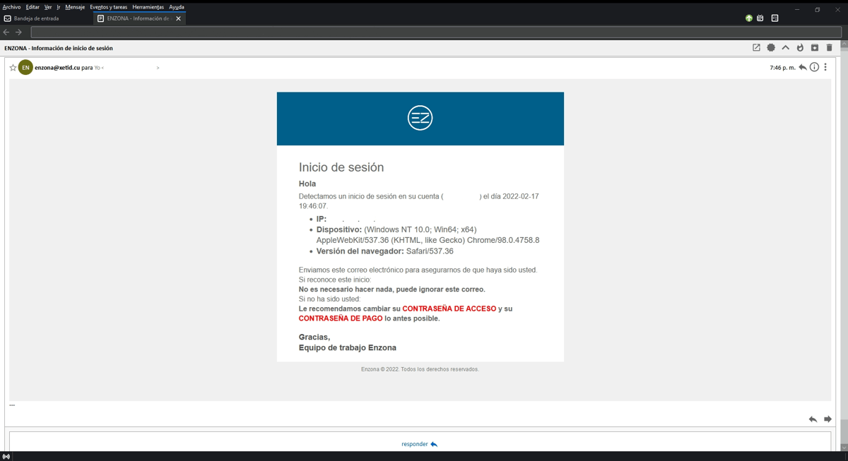 Aviso de inicio de sesión enviado por EnZona vía correo electrónico