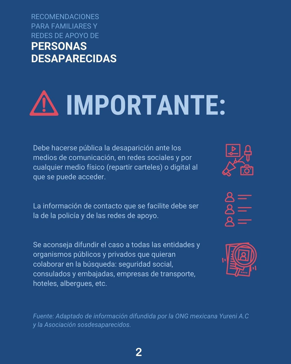 Por su parte, la Asociación sosdesaparecidos, constituida en Murcia en 2007, aconseja, junto a la formalización de la denuncia, hacer pública la desaparición ante los medios de comunicación y las redes sociales; así como repartir carteles en espacios muy frecuentados con la fotografía y datos característicos que indiquen como contacto el número de la Policía o del Servicio de Emergencias. La organización no recomienda citar en los carteles los números telefónicos de la familia para evitar bromas y molestias.