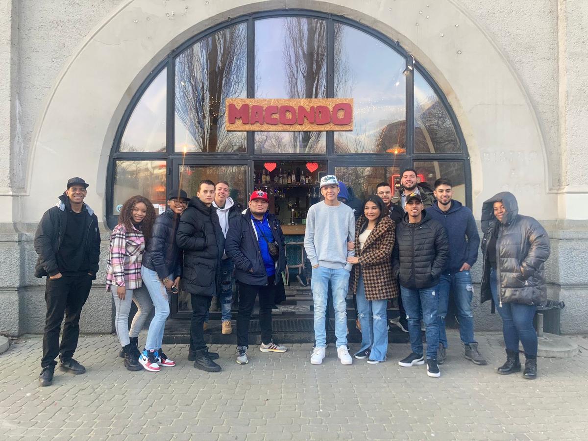 Un grupo de colombianos en la puerta del bar en que trabaja Karla. Foto: Cortesía de la entrevistada.