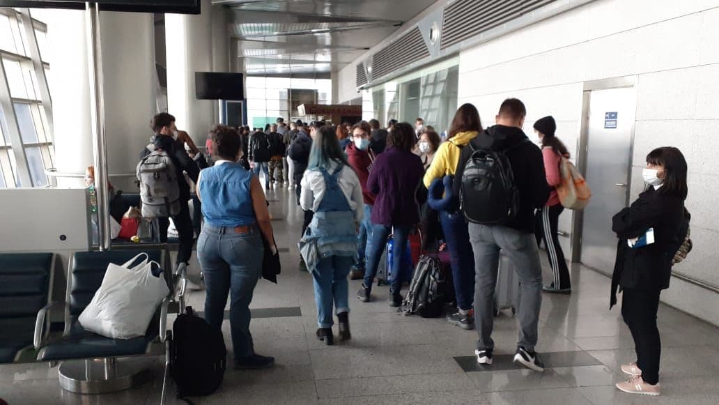 Cubanos en el aeropuerto con la esperanza de poder tomar el vuelo de retorno a Cuba. Foto: Cedida por Ana Voronkova.
