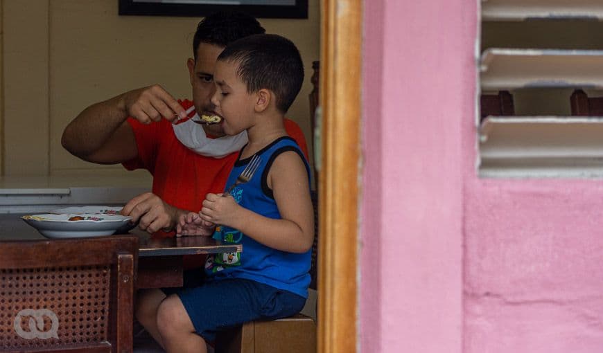 Una pequeña familia reunida a la hora del almuerzo, entre edificios multifamiliares del reparto Camacho, en Santa Clara.
