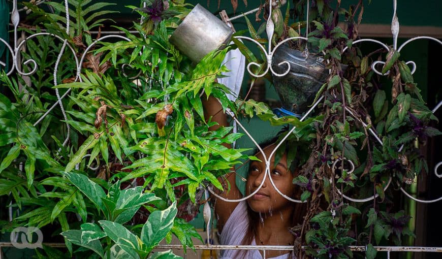 Justo antes del aguacero vespertino una devota de la Regla de Ocha-Ifá, , culto sincrético cubano, cierra las ventanas de su casa.
