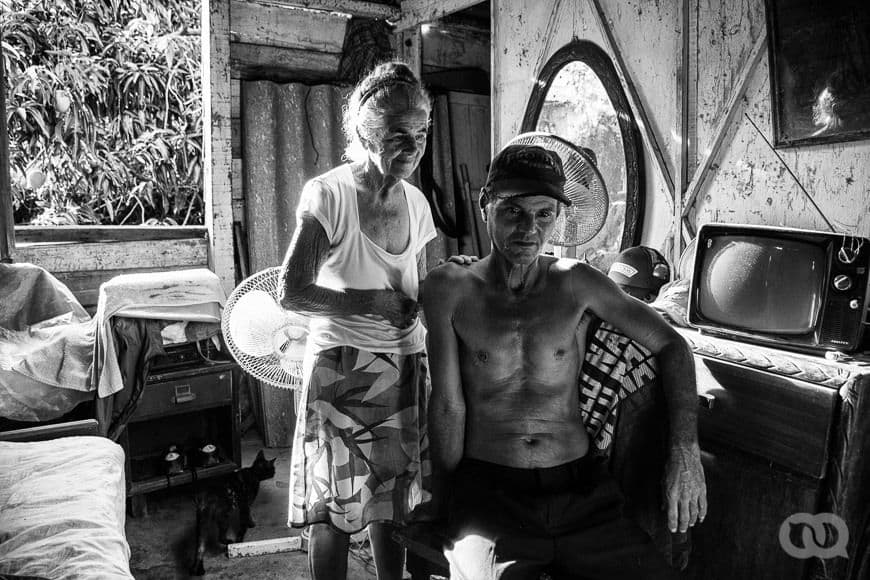 Después de la comida, Rosa y Papelito salen a coger fresco al patio. Atrás queda la mesa con el radio, la licuadora soviética y una botella plástica de ron por la mitad. Foto: Sadiel Mederos