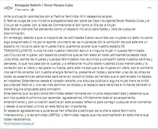 En la publicación alegaron que el festival fue pensado para ser transincluyente. Sin embargo, la respuesta ofrecida ante las quejas persiste un esencialismo biologicista que excluye y violenta a las mujeres trans.