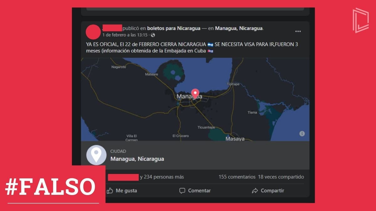 Desde el 22 de noviembre de 2021, los ciudadanos cubanos no necesitan visa para entrar a Nicaragua. Sin embargo, poco tiempo después de esta aprobación comenzó a circular en algunas páginas de Facebook la idea de que dicho país cerraría sus fronteras a Cuba.