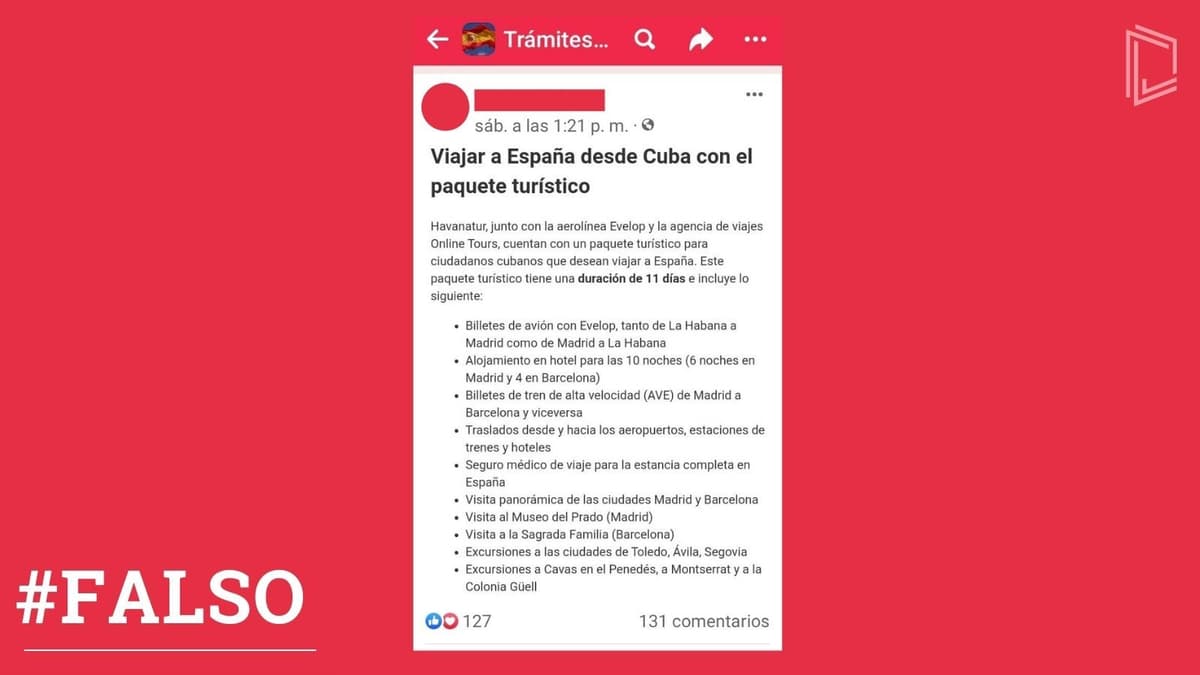 En la página de Facebook Trámites migratorios de Cuba para España está circulando un documento que promueve un paquete turístico para cubanos que quieran viajar a este país ibérico. Esta información es FALSA.