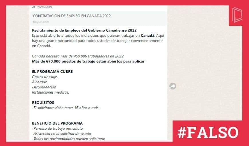 Sobre todo por WhatsApp, está circulando el enlace a un sitio que oferta supuestos empleos en Canadá para individuos de todas las nacionalidades, incluidos cubanos. La propuesta comprende los gastos del viaje, albergue, instalaciones médicas, permiso de trabajo inmediato y asistencia para cambiar la visa una vez se arribe al país. Este contenido es FALSO.